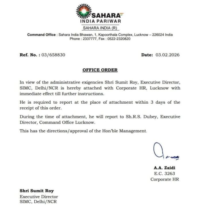 लखनऊ/नई दिल्ली। सहारा इंडिया परिवार में एक अहम प्रशासनिक बदलाव के तहत सहारा मीडिया के हेड और सीईओ सुमित राय को उनके पद से हटाकर सहारा इंडिया के कमांड ऑफिस, लखनऊ में अटैच कर दिया गया है। इस आदेश के बाद सहारा मीडिया कर्मचारियों में खुशी की लहर देखी जा रही है और इसे कर्मचारियों के लंबे आंदोलन की बड़ी जीत के तौर पर देखा जा रहा है। सहारा इंडिया की ओर से जारी आधिकारिक आदेश के मुताबिक, सुमित राय (Executive Director, SIMC Delhi/NCR) को तत्काल प्रभाव से कॉरपोरेट HR, लखनऊ के अधीन कर दिया गया है और उन्हें तीन दिन के भीतर लखनऊ में रिपोर्ट करने का निर्देश दिया गया है। अटैचमेंट की अवधि के दौरान वे एक्जीक्यूटिव डायरेक्टर आर.एस. दूबे को रिपोर्ट करेंगे। यह आदेश उच्च प्रबंधन की स्वीकृति से जारी किया गया है।